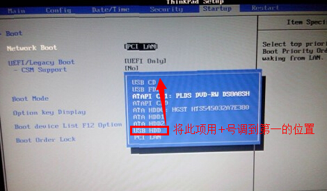1、Thinkpad X220笔记本开机出现Thinkpad开机画面后按F12进入启动选项界面,在弹出的窗口中选择U盘就可以从U盘启动,按F12如果没有出现U盘启动选项,就改下BIOS设置:开机出现第一个界面时按F1进入BIOS,找到startup选项卡中BOOT选项,在NETWORK BOOT中设置为USB HDD,将U盘设置在第一位,修改后按F10保存重新启动如下图: