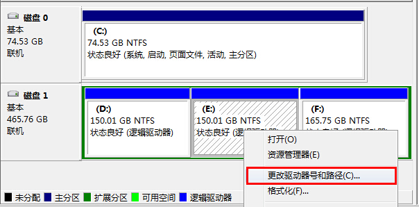 5、这样就可以把这个分区隐藏起来了,那怎么把又它显示出来呢?很简单,同样用右键点击某个分区,选择“更改驱动号和路径”