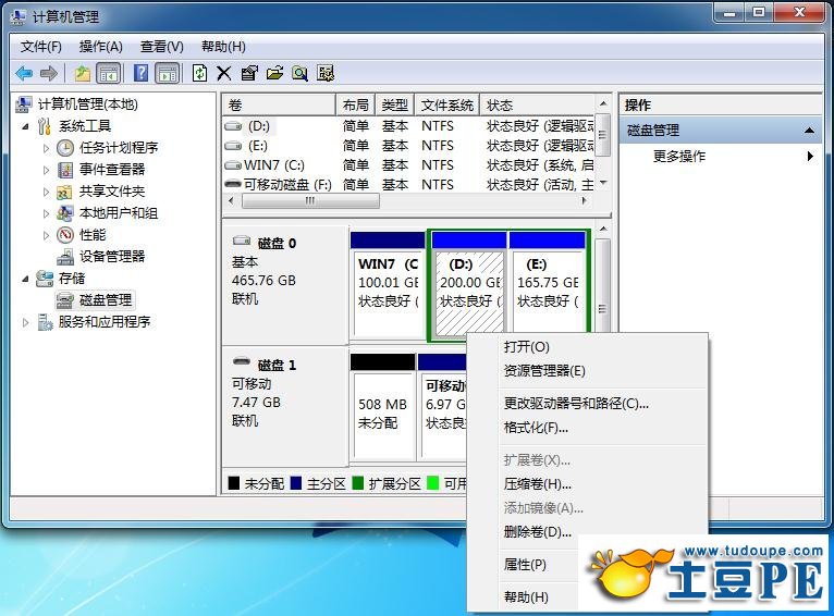 2、在“计算机管理”下点击“磁盘管理”,在右边找到u盘后,右键点击u盘,在出现的下拉选项中选择“删除卷(D)...”,将G卷删除掉,在新建G卷即可。如下图所示: