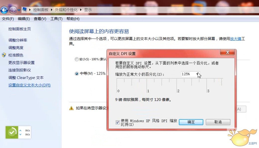 最近有用户向我们反馈在打开土豆 一键重装系统工具时,会出现如上图所示,窗口内容显示不全,确认键按不了,找到文件后,按键盘按Y键也没有任务反应。出现这种现象的原因是系统字体调整调太大,在打开一键重装系统工具时,本身显示框的大小就在出厂时,已经设置好的,字体调大后,使用默认的窗口大小无法显示不出全部内容。针对这一现象,我在WIN7 64位旗舰版系统下,教大家如何调系统字体的大小。