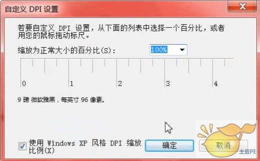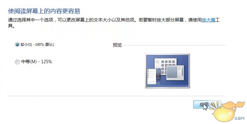 3、打开“设置自定义文本小大(DPI)”选项,将缩放字体大小的百分比125%调整到100%,最后点击应用。