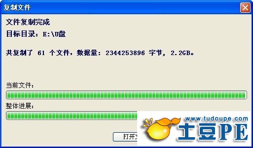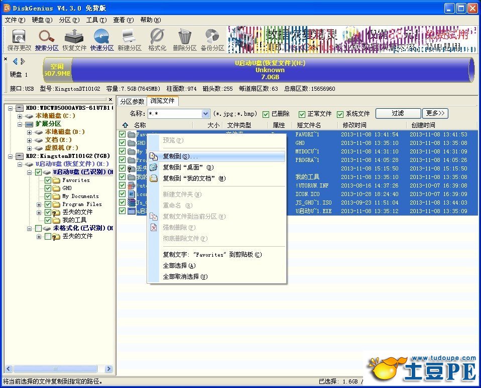 五、点击之后,选择一个位置保存这些所恢复出来的文件,待选择好之后,DiskGenius就会开始将在您U盘上所恢复到文件还原到您所选择的保存位置,如下图所示
