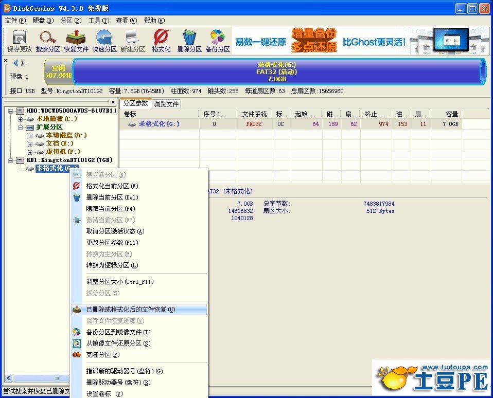 一、首先,将出问题的u盘插入到电脑的USB接口当中。随后双击打开DiskGenius,找到左边的列表图中,找到我们所插入的u盘,之后点击鼠标右键,找到“已删除或格式化后的文件恢复”,如下图