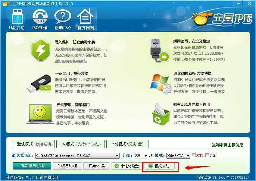 一、打开土豆PE U盘启动盘软件的界面,你会看到一个模拟启动的按钮,如下图所示: