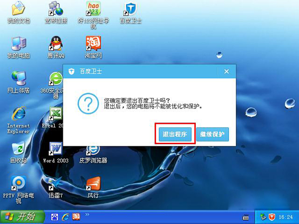 6、百度卫士软件:将鼠标移到百度卫士软件图标上,单击右键,接着点击“退出”选项,在弹出的警告提示窗口中点击“退出程序”按钮,如下图所示: