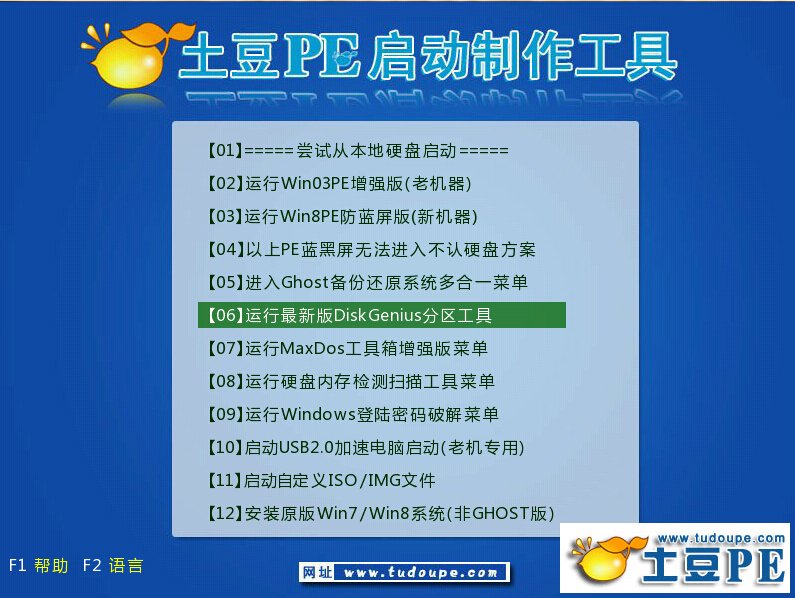 1、u盘启动盘插入到电脑的usb插口处,开启电脑按下相应的快捷键后进入到的主菜单界面,利用键盘上的方向键将光标移至“运行最新版DiskGenius分区工具”后按回车键确认即可;如下图所示: