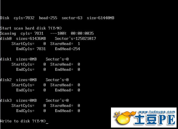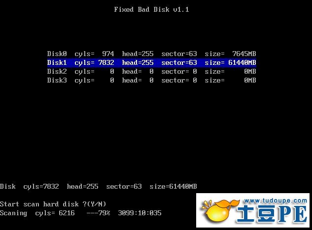 3、现在我们选择需要进行扫描的磁盘,如下图所示:Disk0为小编写教程时的u盘,Disk1为电脑硬盘,当我们将光标移至Disk1后按下回车键是,下方便会出现“Start scan hard disk?(Y/N)”的提示,我们只需要按下“Y”程序便会开始对硬盘进行扫描。如下图所示: