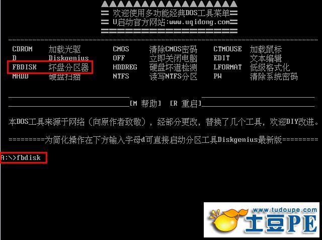 2、 进入到“多功能经典DOS工具菜单”后,我们需要运行的是硬盘坏道检测工具,所以需要在下方“A:\>”后输入“fbdisk”(此处输入的可以是大写也可以是小写)后再按下回车键“Enter”即可运行坏盘分区器,如下图所示: