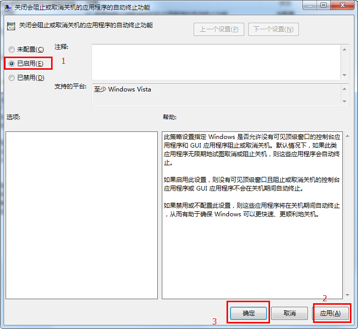 3、双击“关闭会阻止或取消关机的应用程序的自动终止功能”弹出的对话框中,选中“已启用”,然后单击确定。