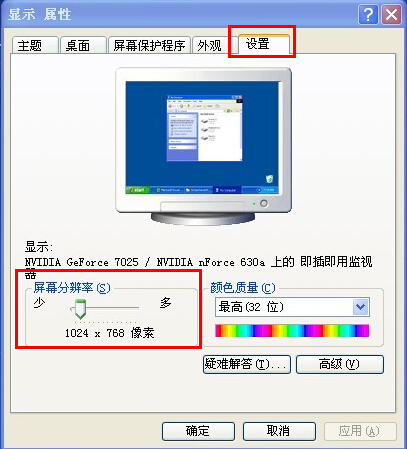 2、XP系统下,鼠标右键点击桌面空白位,选择“属性”,移动设置标签,也可以调整分辨率,以达到你喜欢的图标大小。如下图