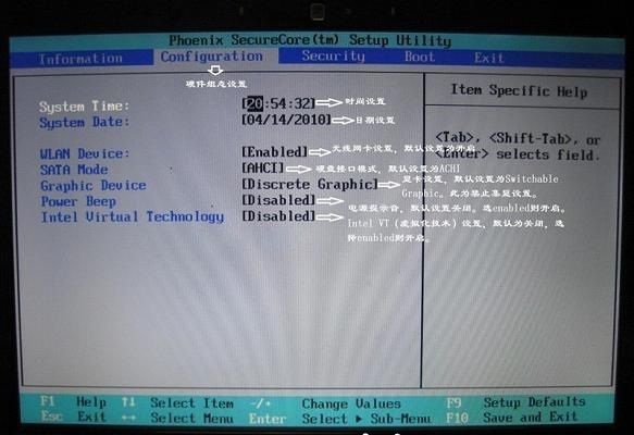 2、下图为硬件组态设置。主要包括:时间、日期设置,无线网卡、硬盘接口模式、显卡、电耗提示音、因特尔虚拟化技术等设置。相关详细设置如下图(图中把AHCI写成ACHI了,特此更正):