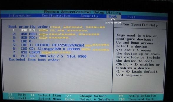 <1>、如果您的启动U盘是用U启动默认一键制作的话,就把USB HDD设置为第一项。先用上下键把白色亮条移动到USB HDD上,然后按F6键直到把USB HDD移到最上面为止。(如果想往下移的话,就按F5)