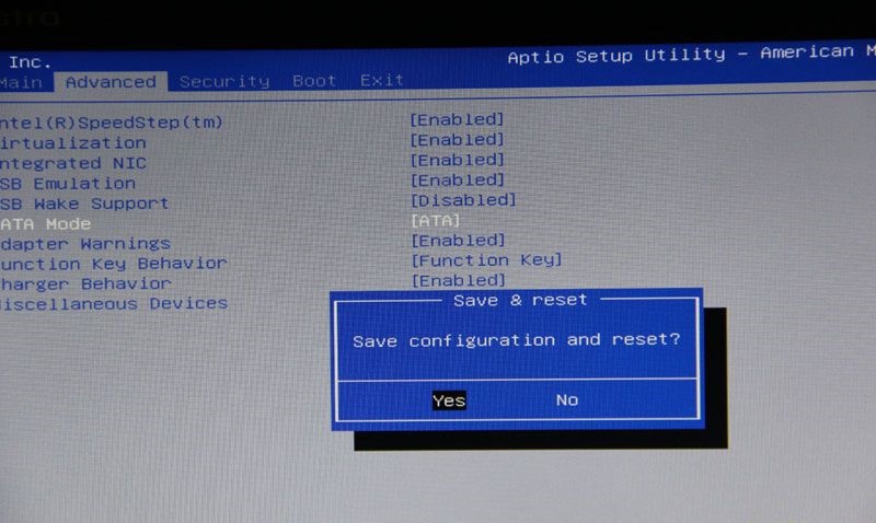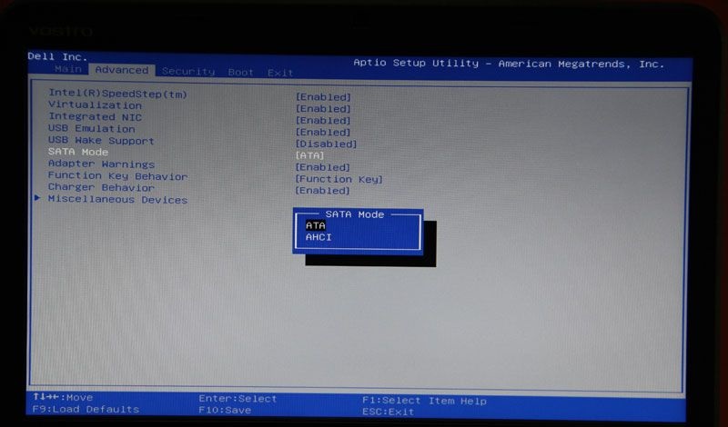 第二步:按F2键进入bios,以此找到Advanced-SATA Mode,然后按Enter键,用键盘的上下键选择ATA。此步的操作的修改硬盘模式,改为ATA模式,以免在安装过程中出现蓝屏。如下图: