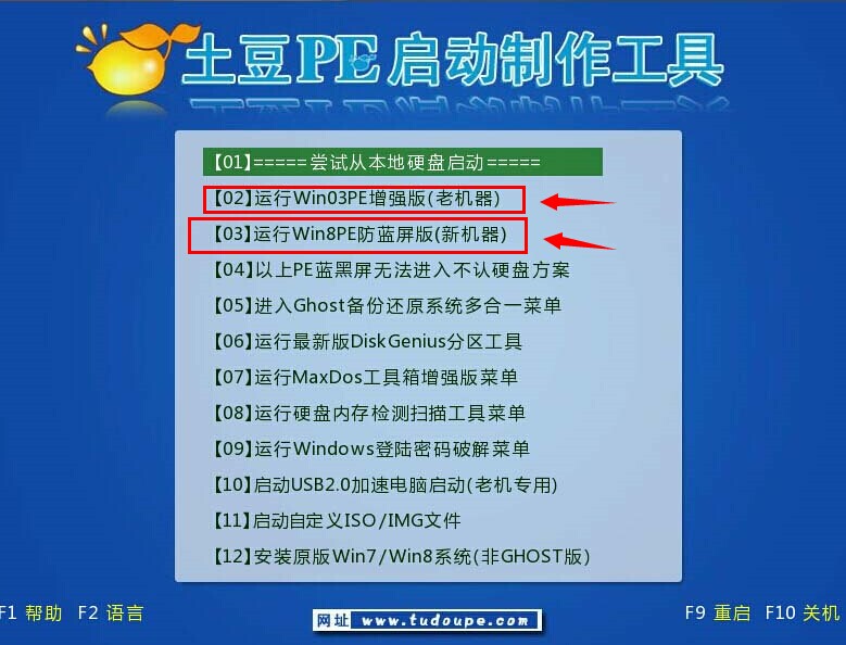 3、图中红色方框标记的为小编所插入的U盘重装系统盘,利用键盘上的上下方向键将光标移至此处,按下回车键,即可进入到如下图所示的土豆PE主菜单画面,选择02或者03选项进入土豆PE系统。