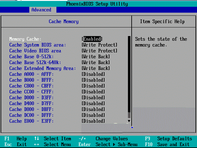 Cache A000-AFFF / B000-BFFF/ C8000-CFFF / CC00-CFFF / D000-DFFF /