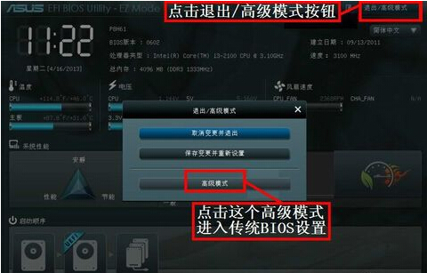 2、进入UEFI BIOS后,点击右上角的“退出高级模式”,并确认,如下图: