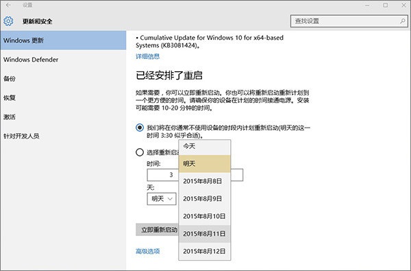 Win10更新后设定时间重启 总是埋怨win10更新后自动重启了,有没有办法可以控制呢?当然有,小篇这就告诉你: 新版的Win10给予了用户非常宽裕的重启时间选择。可以让系统自主选择一...